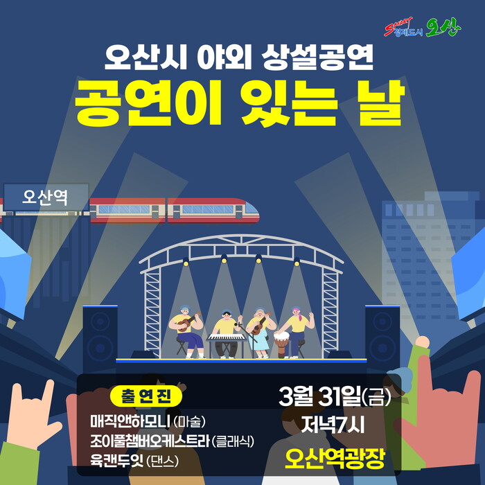 오산시(시장 이권재)는 3월 31일 저녁 7시 오산역, 4월 1일 오후 4시 고인돌공원에서 연이어 ‘공연이 있는 날’을 개최한다고 밝혔다.