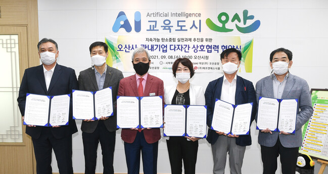 오산시(오산시장 곽상욱)가 기업과 함께하는 탄소중립 실천 문화조성을 위한 관내 기업과의 업무협약을 8일 체결했다. 협약식에는 생분해소재 제품을 개발한 사회적기업 시락푸드(주)와 대상(주) 오산공장, ㈜신세계푸드 오산공장, ㈜후레쉬서브 오산공장, ㈜에프앤에스식품 대표들이 참석했다.