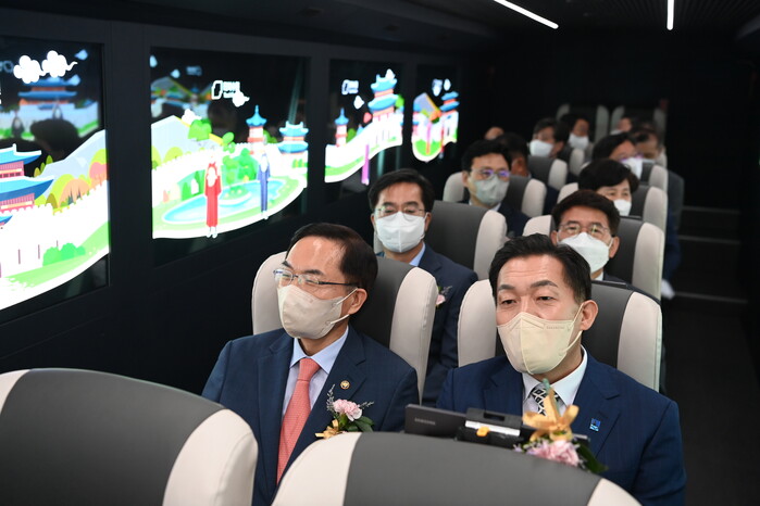 사진/이재준 수원시장(오른쪽) 조용만 문화체육관광부 2차관이 XR버스 1795행을 시승하고 있다.(사진제공=수원시)