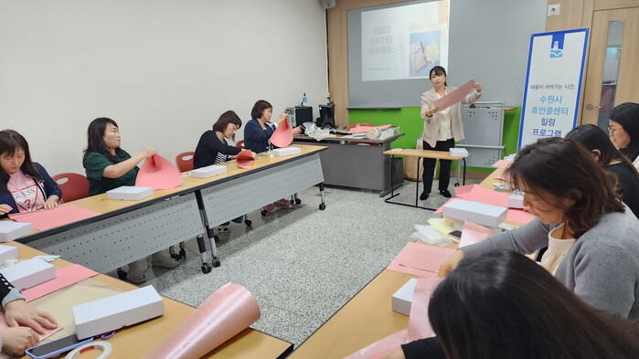 사진/휴먼콜센터 상담사들이 선물포장 실습을 하고 있다.(사진제공=수원시)