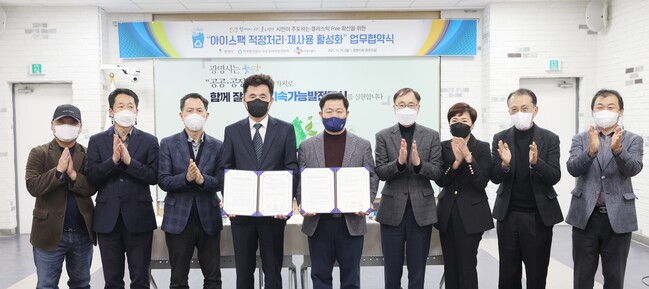 사진/광명시는 11월 15일 시청 중회의실에서 한국환경공단 수도권서부환경본부  CJ프레시웨이(주)와 아이스팩 재사용 활성화 업무협약을 맺었다.(사진제공=광명시)