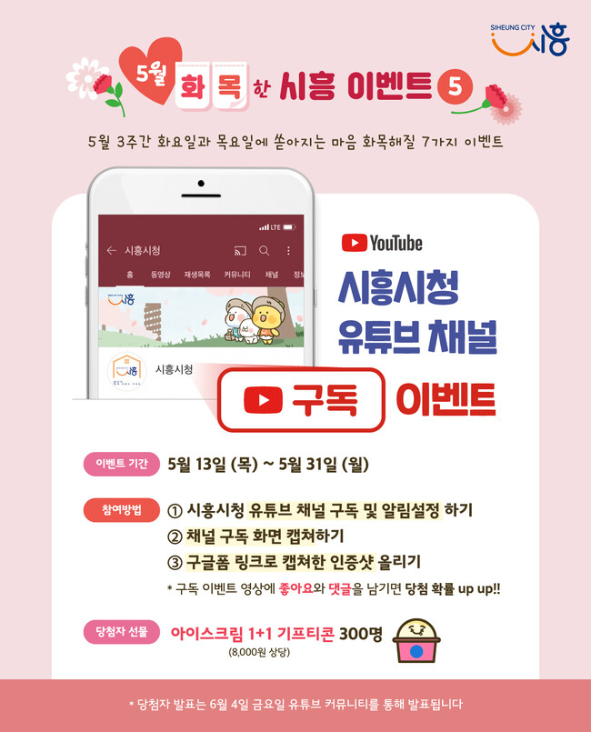 오는 31일까지 시흥시청 공식 유튜브 채널 ‘시흥시청’을 구독하고, 이벤트 영상을 시청한 후 인증샷을 구글폼(https://forms.gle/mRxRFNaK2AJvoJz27)으로 제출하면 참여할 수 있다.