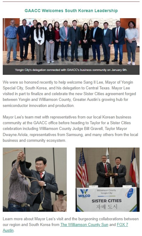 ‘광역오스틴 아시안상공회의소’는 이상일 시장의 미국방문 소식, 용인과 윌리엄슨 카운티의 자매결연 체결과 이를 보도한 기사 내용을 담은 주간 뉴스레터를 각 회원사와 구독자에게 발송했다.