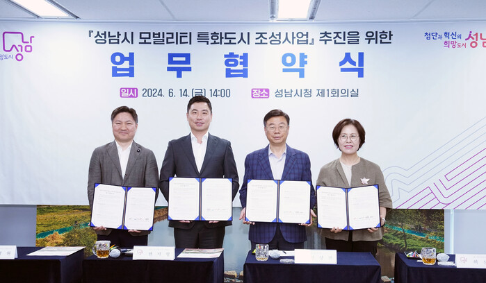 성남시(시장 신상진)는14일 오후2시 시청4층 제1회의실에서 모빌리티 서비스 전문기업3곳과‘모빌리티 특화도시 조성사업을 위한 업무협약’을 체결했다.