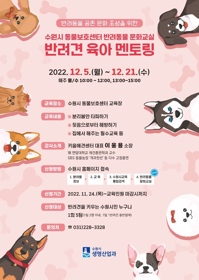 수원시가 반려동물 문화교실 ‘반려견 육아 멘토링’에 참여할 시민을 선착순으로 모집한다.
