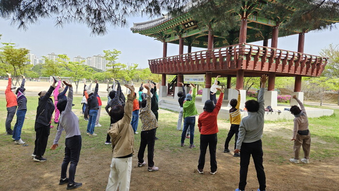 수원시 장안구보건소가 만석공원에서 심신 기능회복에 도움이 되는 한방 기공체조 교실을 연다.
