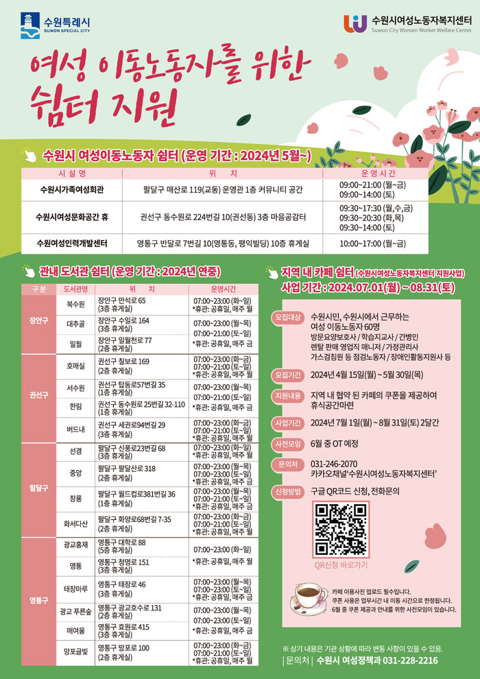 수원시민, 수원시에서 근무하는 여성이동노동자 60명에게는 협약을 한 카페에서 혹서기인 7~8월에 이용할 수 있는 쿠폰을 제공한다. 수원시 여성노동자복지센터에 5월 30일까지 전화(031-246-2070)로 신청하면 된다.