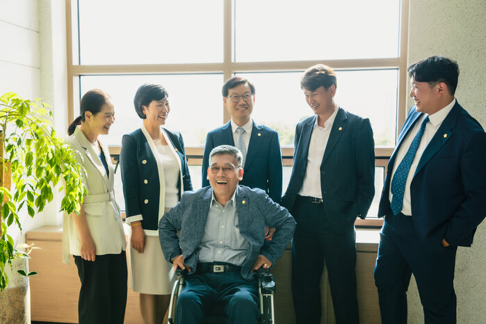 사진/ 교육복지위원회 단체사진(왼쪽부터 김미영, 명미정, 이해남, 송선영, 전성균 의원, 앞줄 이용운 의원)(사진제공=화성시의회)