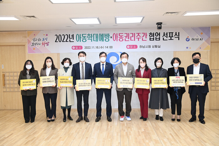 하남시(시장 이현재)는 ‘아동학대 예방의 날(19일)’ 및 ‘세계 아동의 날(20일)’을 앞두고 16일 아동권리 증진 협업 선포식과 아동학대 예방 캠페인을 했다.
