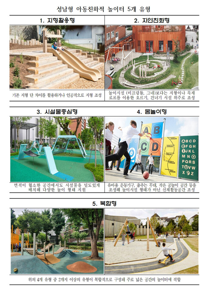 성남시가 아동학과 교수, 박사, 건축전문가 등 6명의 놀이터 전문자문단을 통해 만들어낸 가이드라인에 따라 제작한 ‘성남형 아동친화적 놀이터’ 유형들이다.