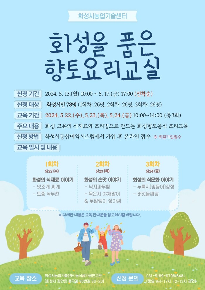 이번 교육은 오는 22일부터 24일까지 3회에 걸쳐 화성시농업기술센터 농식품가공연구관에서 화성시민을 대상으로 진행되며, 화성 고유의 식재료와 조리법을 활용해 만들 수 있는 화성의 전통 향토음식을 선보인다.