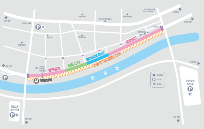 20일(토) 09시부터 20시까지 옥천교~안성교 사이 강변도로 0.7km의 교통통제로 소풍존, 장터존, 플리마켓존, 열린공간으로 구성되며 소풍존 내에서는 개인 돗자리를 지참하면 소풍을 즐길 수 있으며, 한경대학생 동아리연합회 재능기부로 4차례 소규모 버스킹 공연도 추진 예정이다. 또한 업무협업을 통한 환경그림 그리기 대회 10:30~15:00(주최 안성시 환경과, 동 구간), 버스킹 및 영화상영 15:00~21:00(주최 안성미디어센터, 안성천변 족구장 구간)도 동시 추진할 계획이다.