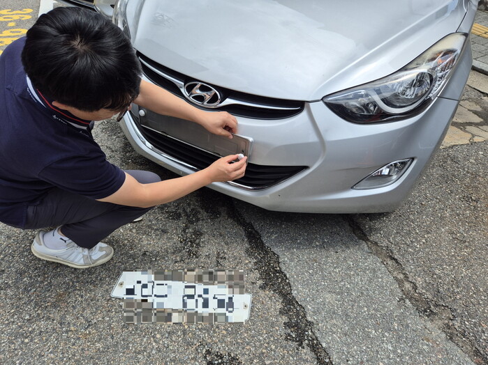 사진/ 수원시 관계자가 체납차량의 번호판을 영치하고 있다.(사진제공=수원시)