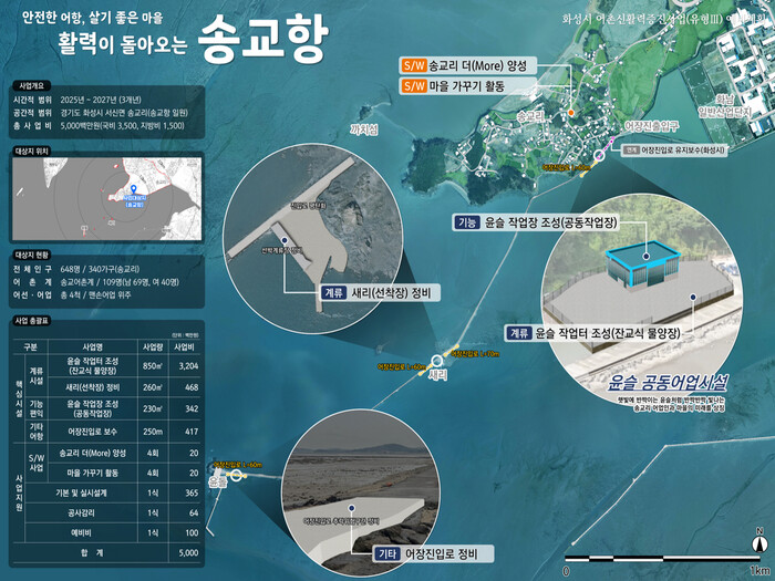 시는 오는 2027년까지 3년 간 국비 35억원을 포함한 총사업비 50억 원을 투입해, 송교항 일원에 어업활동을 위한 물양장과 공동작업장을 신규 조성하고 어장진입로와 선착장을 보수하는 등 지역 주민이 장기간 염원해 온 어항 노후환경 및 안전시설 정비를 추진할 계획이다.