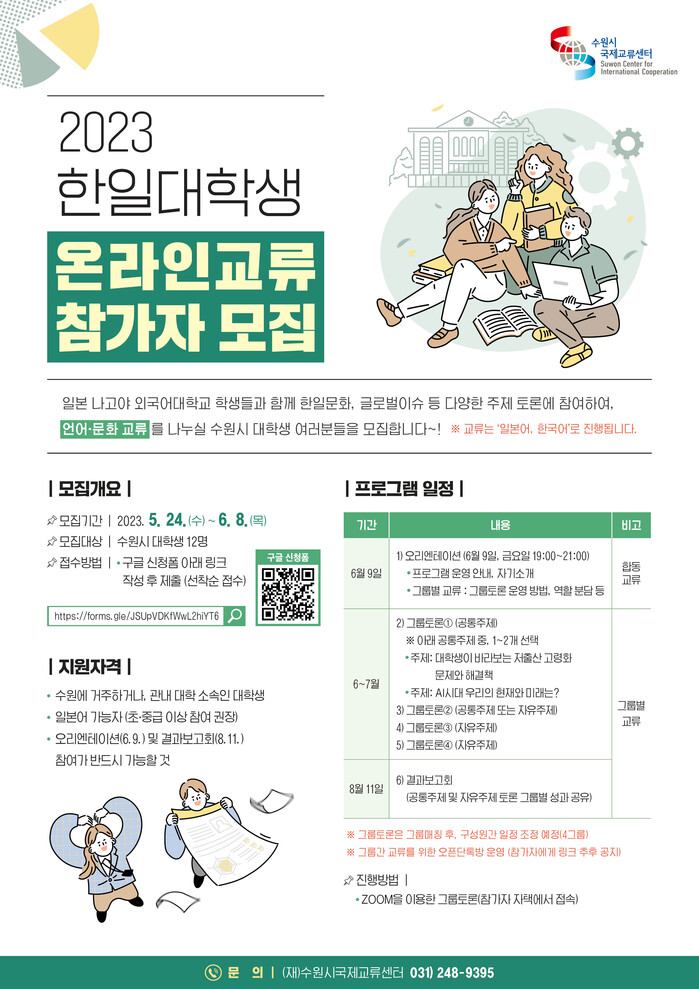 6월 8일까지 12명을 모집한다. 수원에 거주하거나 수원에 있는 대학에 다니는 학생이 참여할 수 있다. 일본어를 할 수 있어야 한다. 구글폼(https://forms.gle/JSUpVDKfWwL2hiYT6)을 이용해 신청해야 한다.