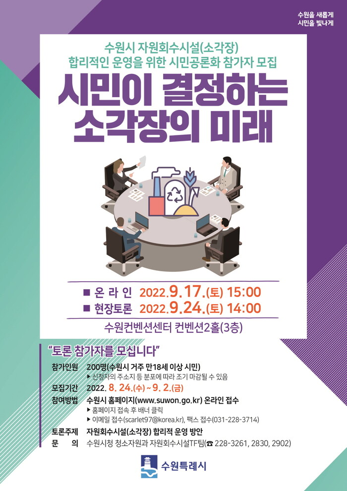 수원시가 자원회수시설(영통 소각장)의 합리적인 운영 방안을 결정하기 위해 시민 공론화를 추진한다. 8월 24일부터 9월 2일까지 공론화에 참가할 시민을 모집한다.