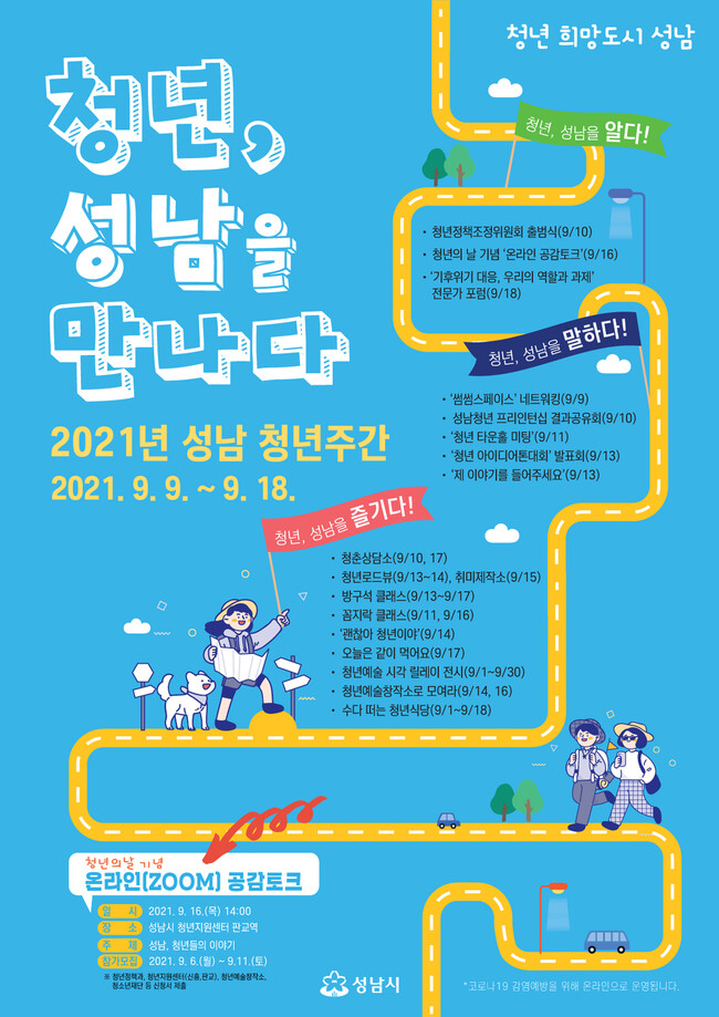 청년을 위한 문화조성 및 청년문제에 대한 관심을 높이고 시민 공감대 확산을 위해서다. 지난해 8월 청년기본법이 제정되고 청년의 날이 법정기념일로 지정되면서 성남시에서 처음으로 개최하는 청년주간 행사로 ‘청년의 날 기념 온라인 공감토크’를 메인 행사로 청년의 감수성을 반영한 20개의 다양한 프로그램으로 운영한다.