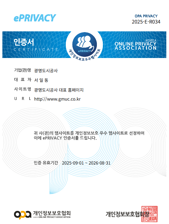 광명도시공사(사장 서일동, 이하 공사)는 8월 29일(금)‘개인정보보호 우수 사이트 인증 (ePRIVACY)’마크를 7년 연속 획득했다고 밝혔다.