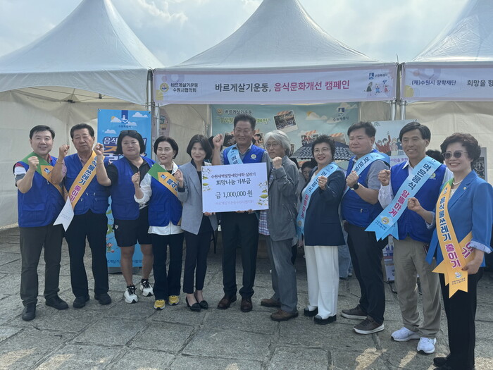 바르게살기운동 수원시협의회가 26일 음식문화개선 캠페인을 펼치고, 새벽빛야학 후원금을 수원시자원봉사센터에 전달했다.