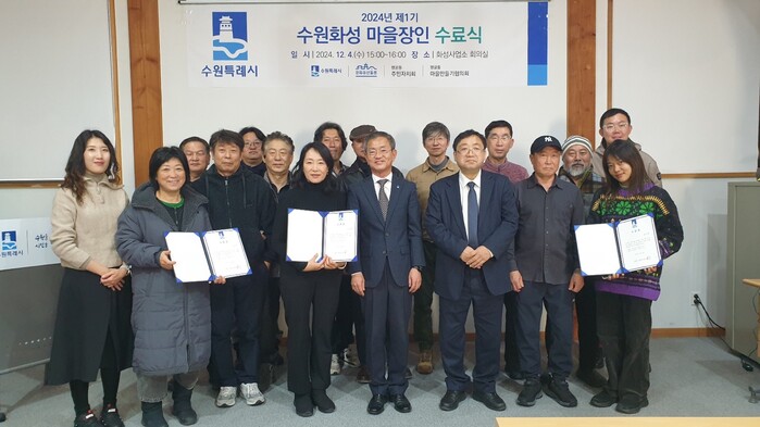 수원시(시장 이재준)가 4일 화성사업소에서 제1기 ‘수원화성 마을장인 사업’ 수료식을 열고, 교육생 11명에게 수료증을 수여했다.