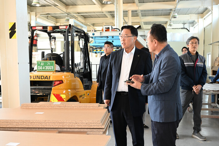 강수현 양주시장이 지난 17일 은현면 소재 가구 제조 기업 대지산업(대표 이문규)을 찾아가 산업현장의 목소리에 귀를 기울였다.