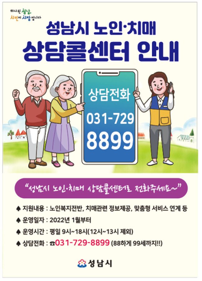 성남시는 내년 1월 3일부터 ‘노인·치매 통합지원 상담콜센터(☎031-729-8899)’를 운영한다.