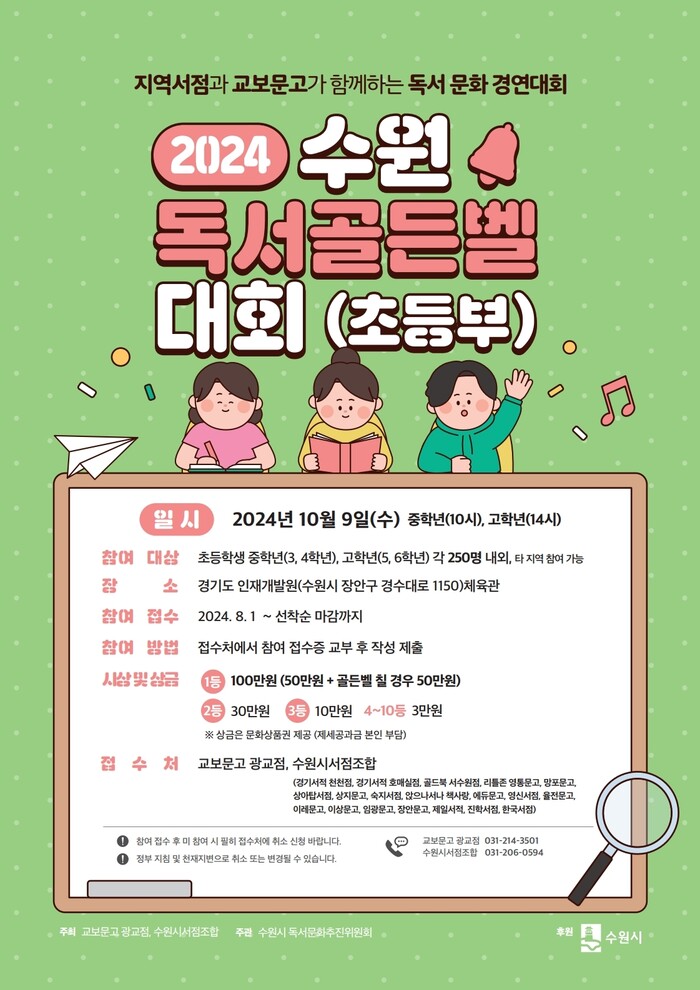 수원시 서점조합과 교보문고 광교점이 주최하고 수원시가 후원하는 ‘2024 수원 독서골든벨 대회’는 초등학교 중·고학년별 선정 도서 각 10권을 읽고 문제를 푸는 대회다.