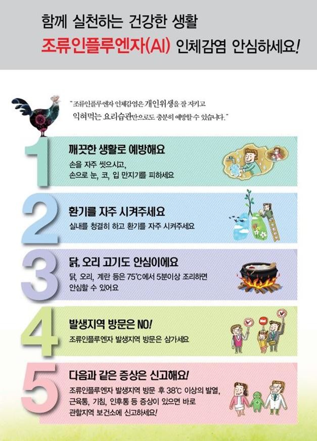 아울러, 시민들이 개인위생수칙을 준수하고 당분간 조류인플루엔자 발생농가나 지역의 방문을 자제하며 충분히 익혀먹는 요리습관을 실천한다면 조류인플루엔자(AI) 인체감염을 충분히 예방할 수 있다고 보건소 관계자는 전했다.