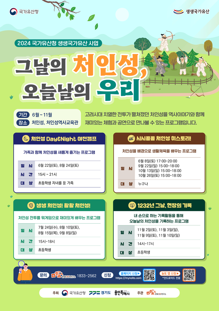 지난 2015년부터 10회 연속으로 공모사업에 선정된 생생 문화유산 활용사업 ‘그날의 처인성, 오늘날의 우리’는 경기도 기념물 44호인 처인성을 주제로 프로그램을 운영한다. 이 프로그램에서는 ‘처인성 Day&Night 야전캠프’, ‘생생 처인성! 활활 처인성!’, ‘시시콜콜 처인성 히스토리!’, ‘1232년 그날, 현장의 기록’ 등 4개 프로그램이 6월 8일부터 진행된다.