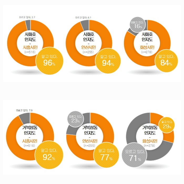이번 조사는 시흥(516명), 안산(255명), 화성(278명)을 대상으로 95% 신뢰수준에 표본오차는 각 ±4.31%p, ±6.14%p, ±5.88%였다. 관련 내용은 시흥시 정책기획과(031-310-3636)로 문의하면 된다.