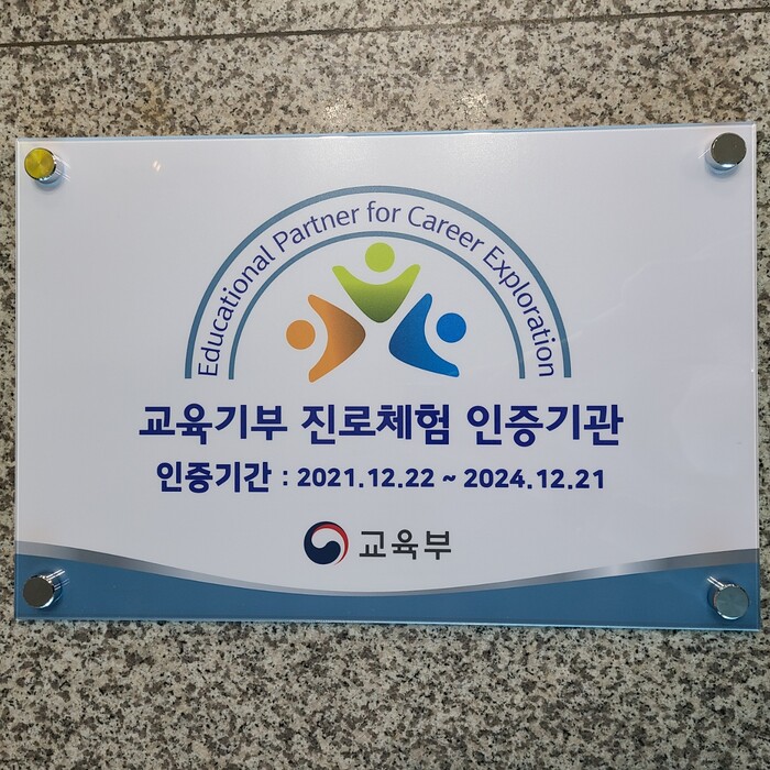‘교육기부 진로체험 인증제’는 체험처의 성격과 환경 및 안전성, 프로그램의 우수성 등 3가지 영역을 충족해야 하며, 초・중・고 학생에게 무료로 양질의 진로체험 기회를 제공하는 기관을 심사하여 교육부가 인증하는 제도이다.