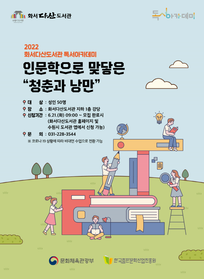 수원시 화서다산도서관이 2022년 독서아카데미 프로그램 ‘인문학으로 맞닿은 청춘과 낭만’ 강좌에 참여할 수강생 50명을 선착순으로 모집한다.