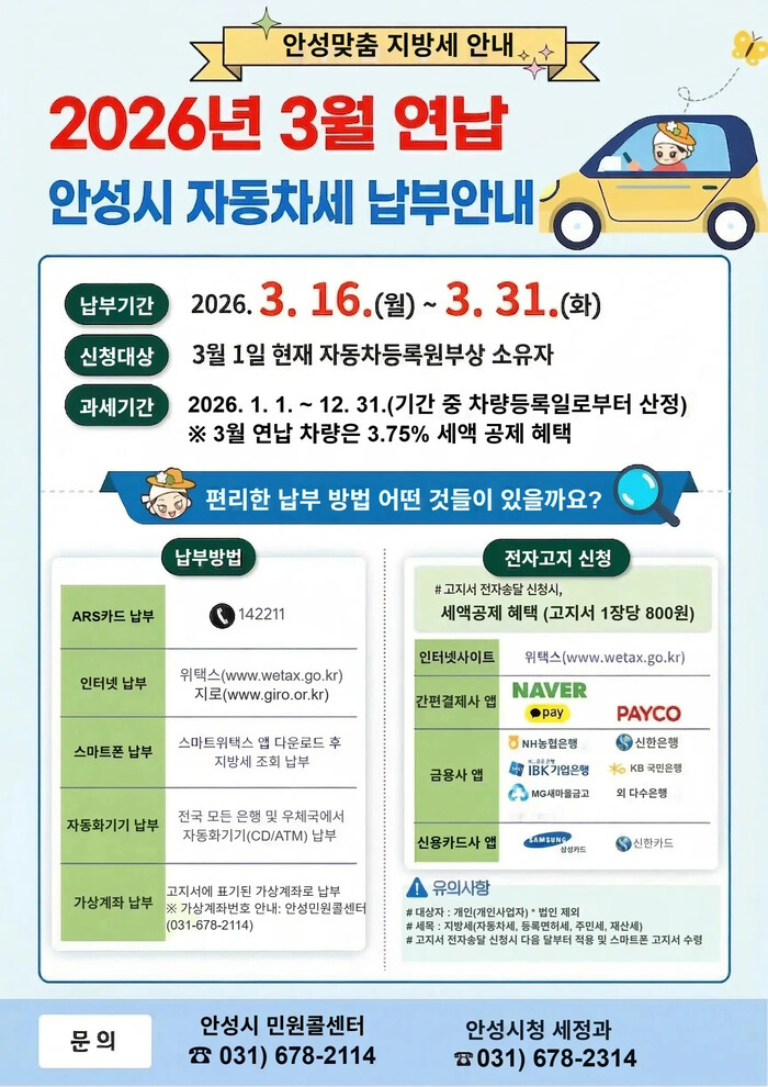 자동차세 연납과 관련한 자세한 사항은 안성시청 세정과(☎ 031-678-2314)로 문의하면 안내받을 수 있다.