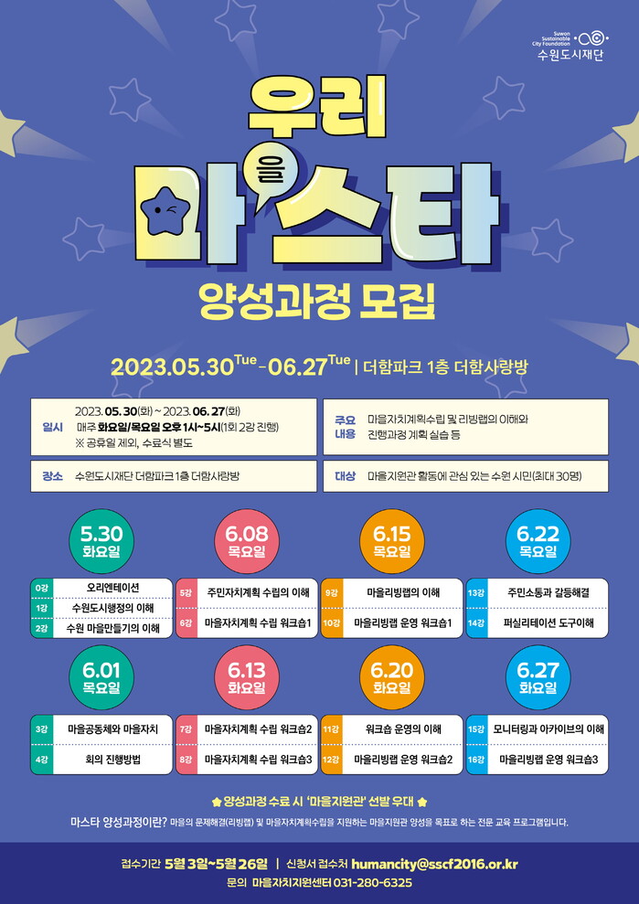 수원시는 마을지원관 학교인 ‘마을 마스타 과정’을 5월 30일부터 6월 27일까지 8회에 걸쳐 수원도시재단 1층 더함사랑방에서 운영한다.