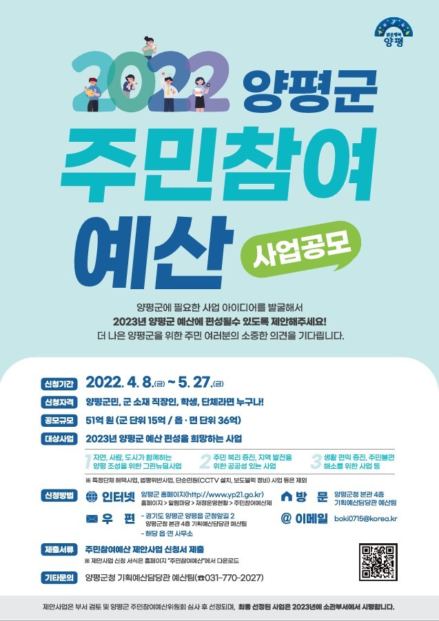 양평군(군수 정동균)에서는 2023년 예산편성을 위한 주민참여예산 제안사업 공모사업을 4월 8일부터 5월 27일까지 약 2달간 접수한다고 밝혔다.