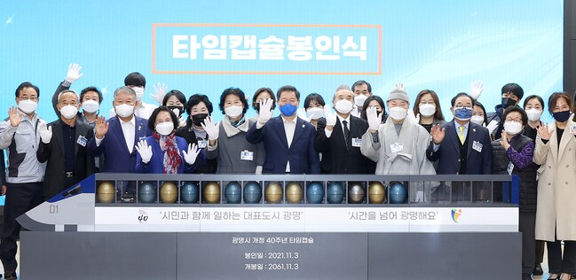 40년 동안 소장품을 보관할 타임캡슐은 KTX광명역이 남북평화철도출발역이 되기를 바라며 길이 4m, 높이 1m의 KTX 고속열차 모형으로 만들었다. 참석자들은 소장품이 담긴 용기를 타임캡슐에 넣었으며 광명시는 40주년 기념 홍보 영상, 사진, 시정안내책자, 코로나19백서, 광명·시흥 신도시 계획 관련자료 등을 넣었다.