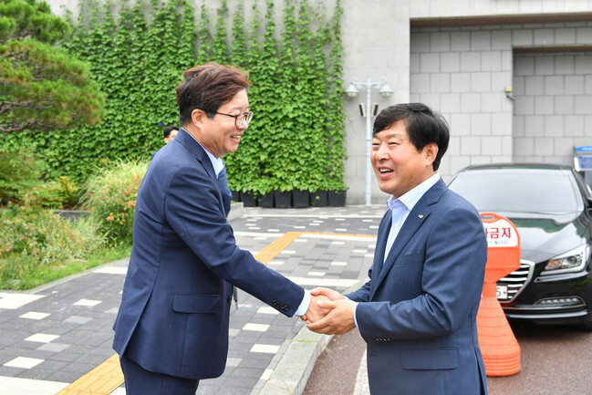 사진)2019년 7월, 염태영 시장(왼쪽)이 ‘일일 명예수원시장’으로 수원시청을 찾은 황명선 논산시장과 인사하고 있다. (사진제공=수원시)