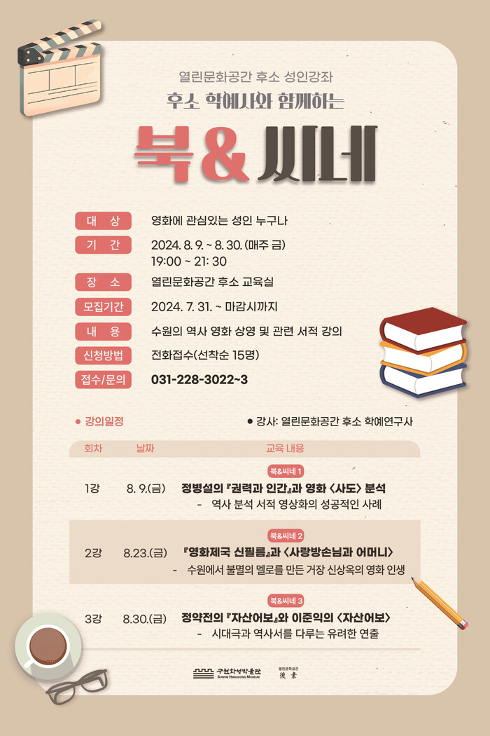 ‘후소 학예사와 함께하는 북&씨네’는 8월9일부터 30일까지 매주 금요일 오후 7시부터 9시30분까지 진행될 예정이다. 후소 담당 학예사가 강사로 나서 수원의 역사와 관련한 영화와 책을 주제로 강연을 펼친다. 후소 교육실에서 정조와 수원의 역사와 관련한 영화를 상영한 후 작품의 모티브가 되거나 관련이 있는 책에 대한 이야기를 나누게 된다.