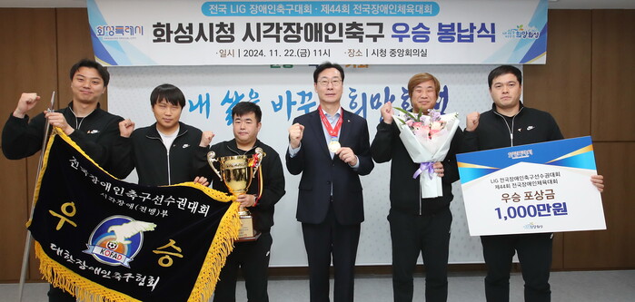 22일 시청 중앙회의실에서 열린 봉납식에는 지준민 시각장애인 축구팀 감독과 김자온·장영준·신윤철·배현진 선수가 참석해 정명근 화성시장에 LIG 전국장애인 축구선수권대회 우승 트로피와 전국장애인축구선수권대회 우승기를 전달하며 우승의 기쁨을 나눴다.
