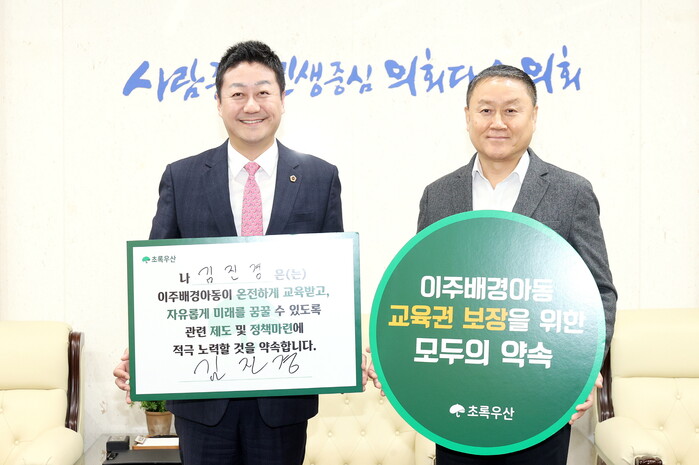 초록우산 어린이재단 시흥다어울림아동센터 박원규 소장과 관계자들이 함께한 서명식에서 김 의장은 서약서에 친필 서명하며 이주배경아동 지원에 대한 의지를 밝혔다.