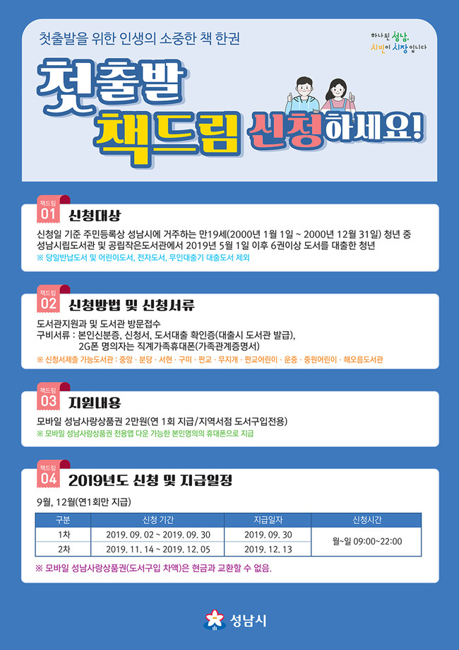 첫 출발 책드림 사업은 공공도서관에서 6권 이상의 책을 빌려본 만 19세 청년(2000년생)에게 2만원 상당의 모바일 성남사랑상품권을 지급하는 청년독서정책이다.