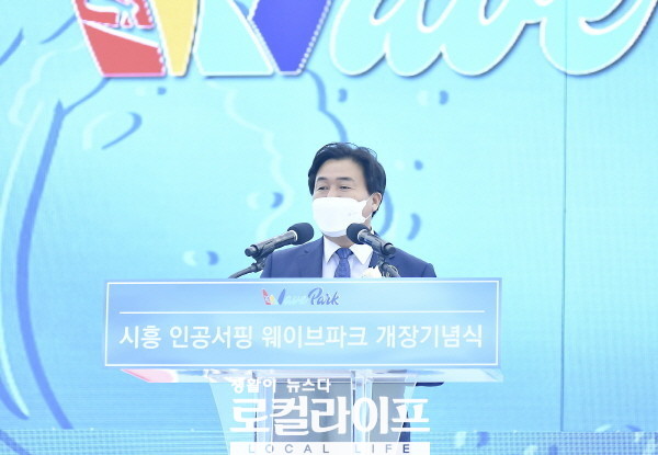 | ▲ 임병택 시흥시장은 세계 최대 규모의 인공서핑 랜드마크인 ‘웨이브파크’, 미래신산업 육성을 위한 ‘K-골든코스트’ 사업 추진을 통해 시흥의 미래백년을 완성하겠다는 계획이다. 사진은 임병택 시장이 ‘웨이브파크’ 개장식에 참석해 축사를 하는 모습. (사진제공=시흥시) |
