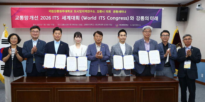 강원특별자치도의회 미래 모빌리티 특별위원회(위원장 김용래)는 7월 18일 강릉시의회에서 강릉시의회 2026강릉ITS지원 특별위원회, 강릉원주대학교 도시 및 지역연구소, 한국ITS학회와 함께 '2026 강릉 ITS 세계총회'의 성공적인 개최와 미래 모빌리티 혁신 기반 조성을 위한 업무협약을 체결했다.