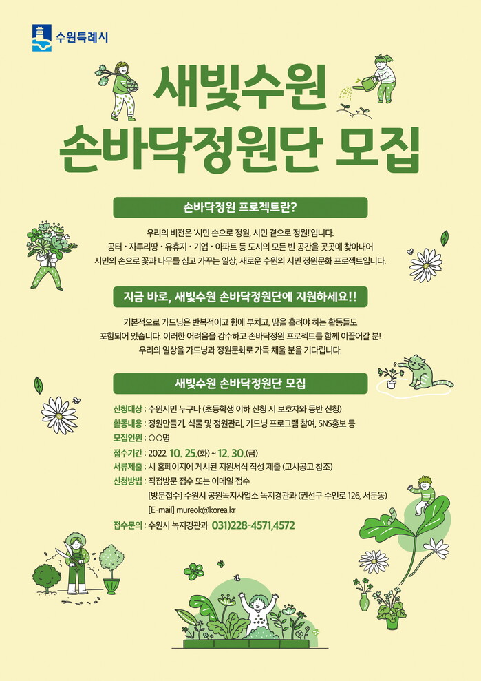 수원시는 2023년 400개를 시작으로 2026년까지 손바닥 정원 1000개를 조성하는 것을 목표로 사업을 추진한다. 12월 30일까지 손바닥정원 프로젝트에 참여할 ‘새빛수원 손바닥정원단’ 단원을 모집한다.