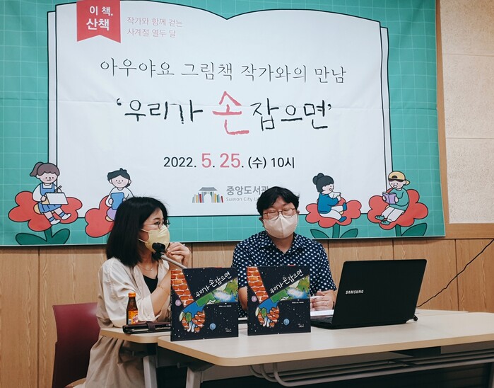 ‘2022 경기도 문화의 날’ 문화예술 지원 프로그램인 이번 강연은 그림책 「우리가 손잡으면」을 집필한 아우야요 작가(박기웅 작가의 필명)가 시민 50여 명을 대상으로 대면·비대면(화상회의 프로그램) 병행 방식으로 진행했다.