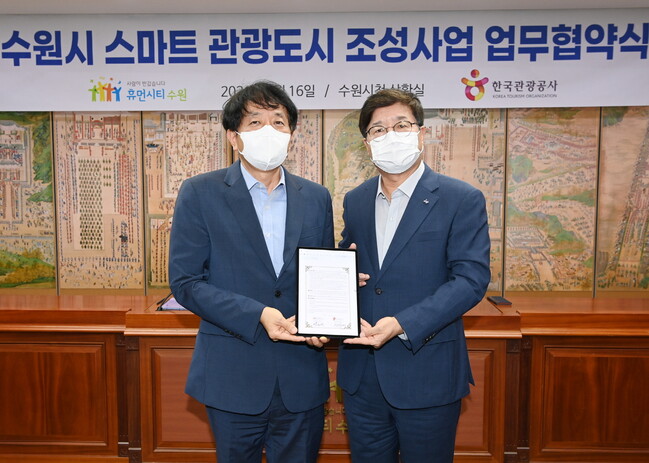 수원시와 한국관광공사는 16일 시청 상황실에서 ‘스마트 관광도시 조성사업 추진을 위한 업무협약’을 체결하고, 수원화성 관광특구 일원을 스마트관광도시로 조성하는 데 협력하기로 했다.