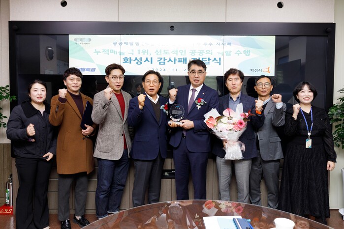 화성시(시장 정명근)가 경기도 공공배달앱 ‘배달특급’의 누적 거래액 460억 원을 달성해 우수지자체로 선정돼 22일 화성시청에서 경기도 주식회사와 감사패 전달식을 가졌다.