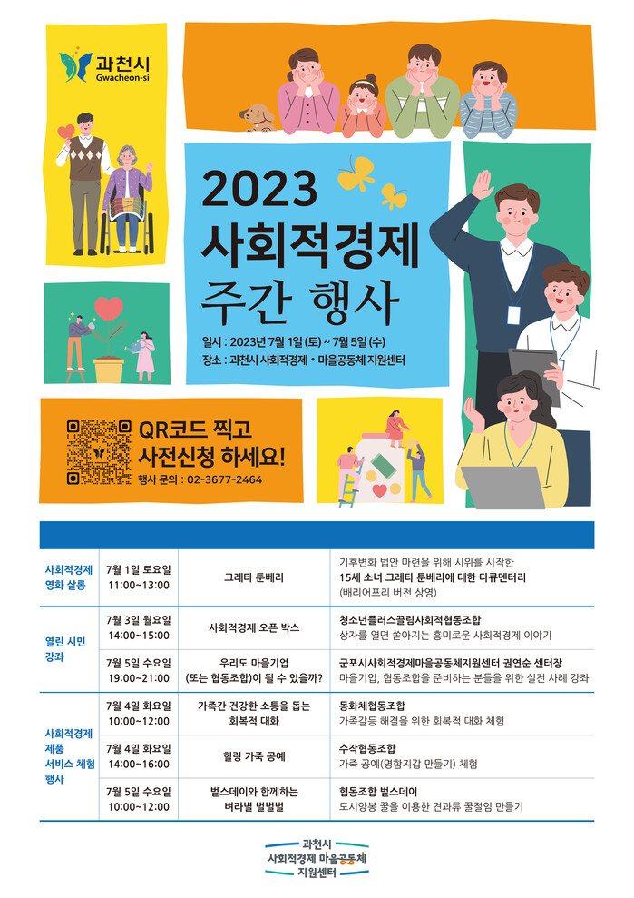 행사에 대한 자세한 사항은 과천시사회적경제·마을공동체 지원센터(www.gccity.go.kr/gcsemc), 또는 전화(02-3677-2464)로 문의하면 된다.
