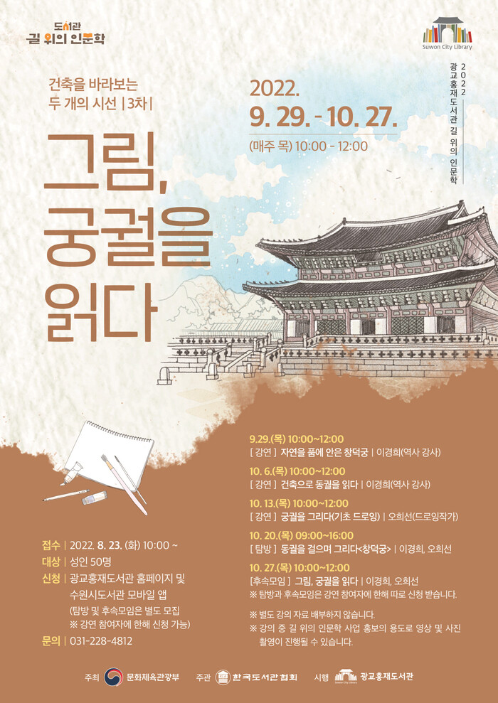 수원시 광교홍재도서관이 문화체육관광부가 지원하는 2022 길 위의 인문학 ‘건축을 바라보는 두 개의 시선: 3차 그림, 궁궐을 읽다’ 수강생 50명을 선착순으로 모집한다.