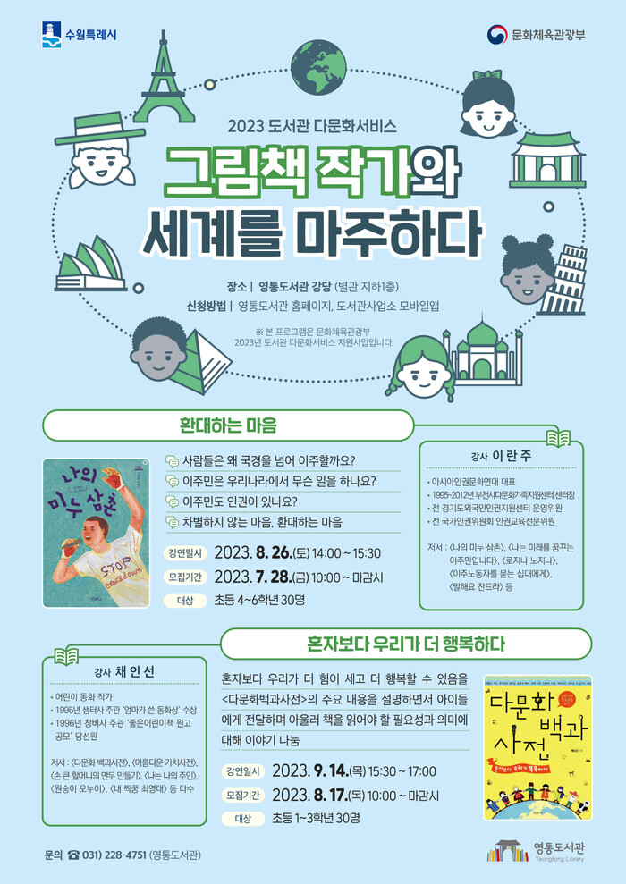 수원시 영통도서관은 어린이 대상 다문화프로그램 ‘그림책 작가와 세계를 마주하다’에 참가할 초등학생 1~3학년 학생을 모집한다.